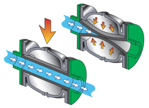 As pressurized air or water enters the housing, the sleeve is pinched shut. Venting the pressure allows the valve to resume full normal flow.