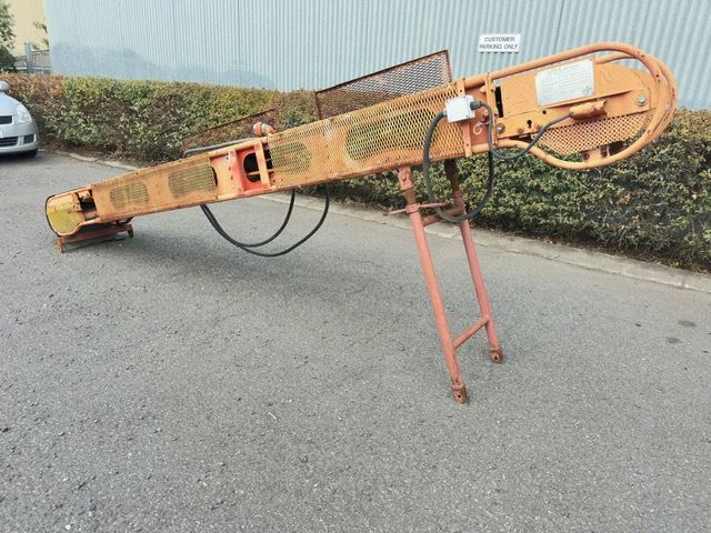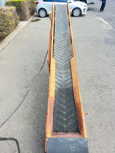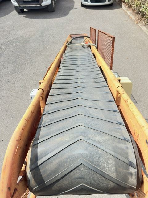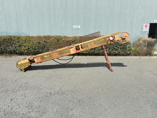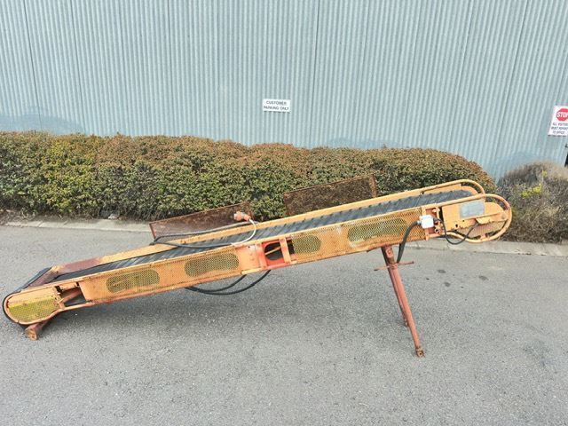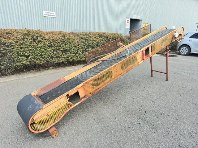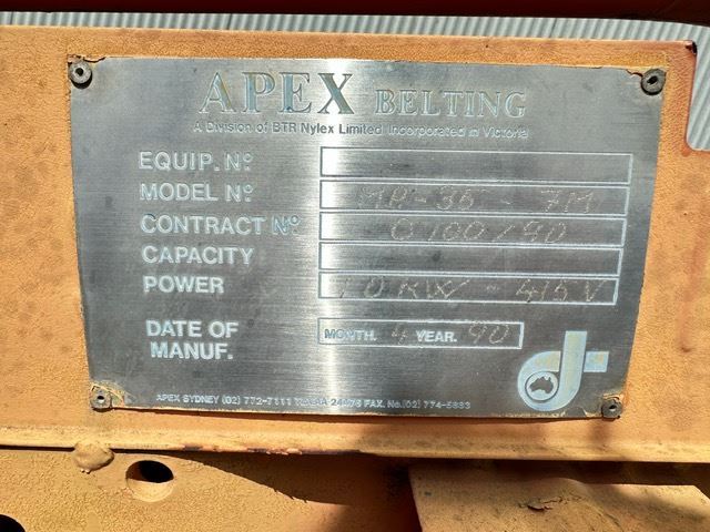 APEX belt conveyor, fitted with a 1kw motor running at approx 300rpm. Rubber trough type belt with ribs.