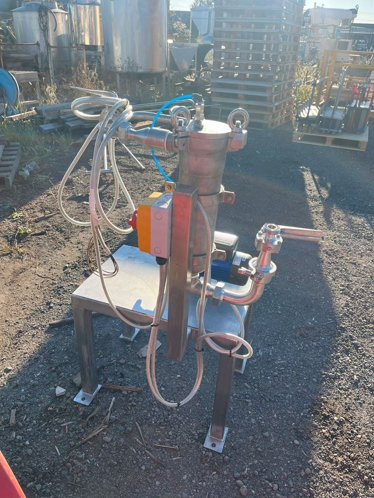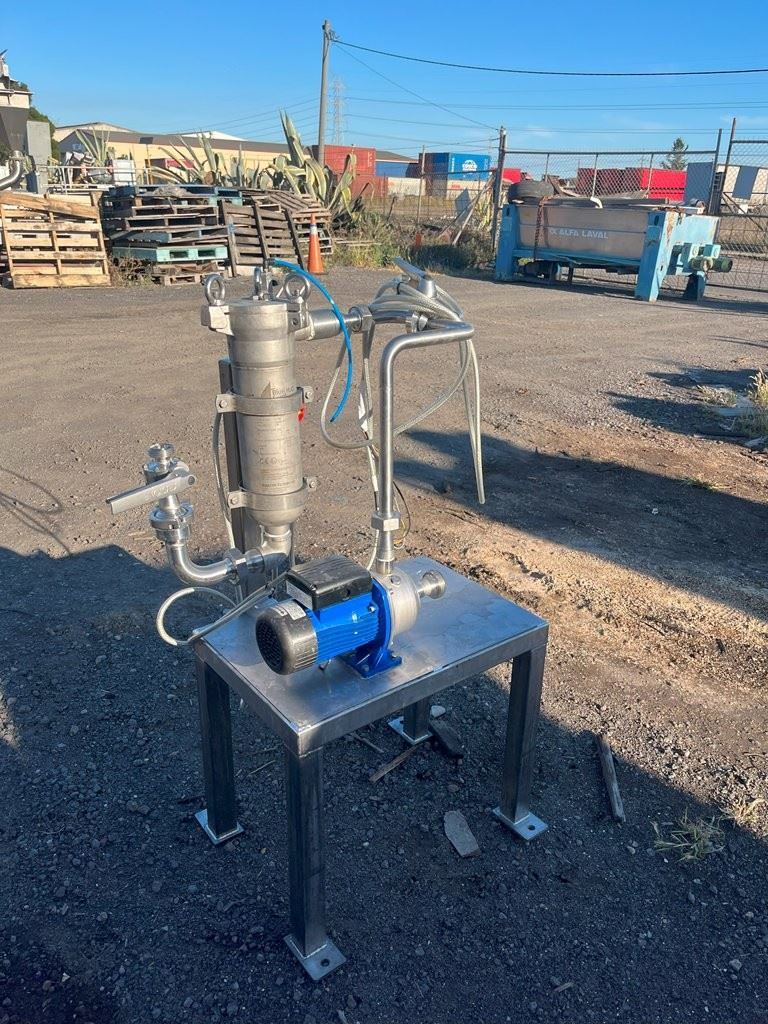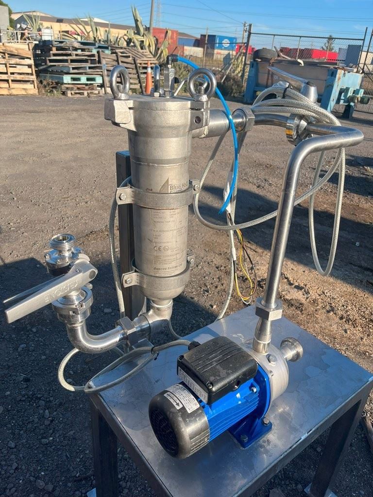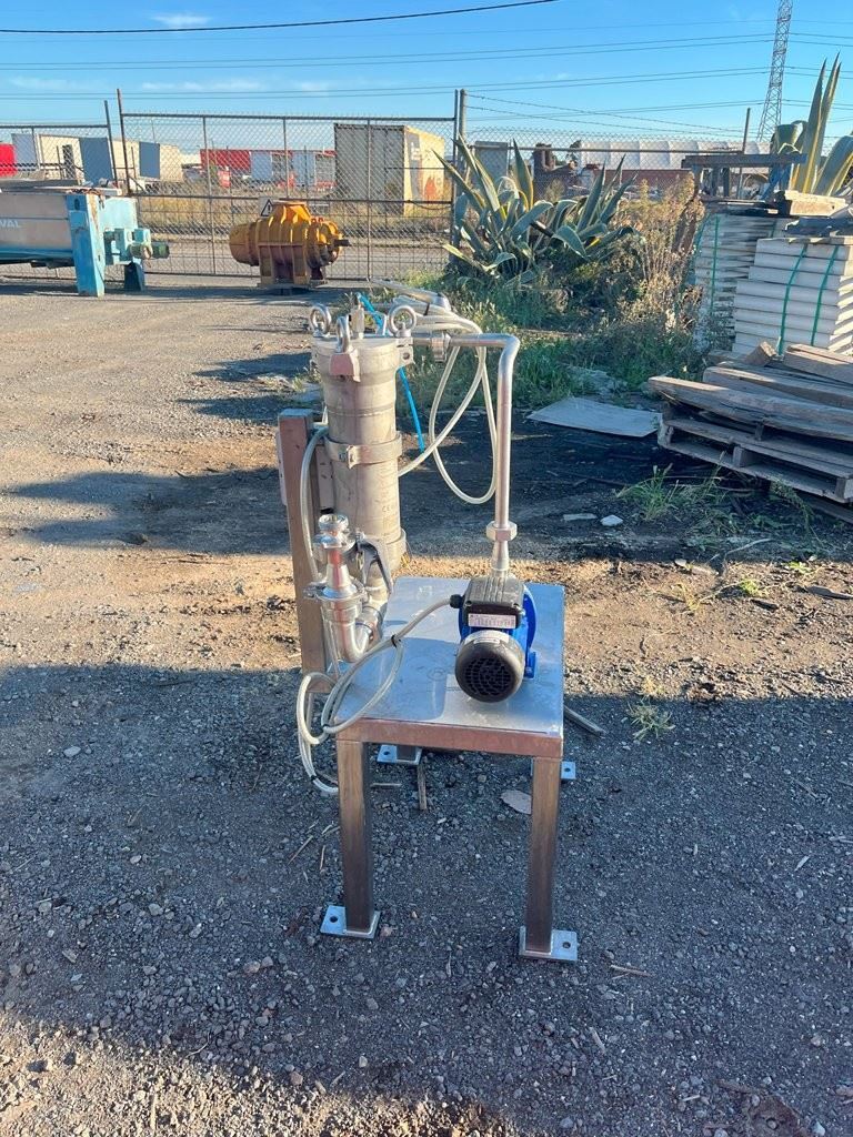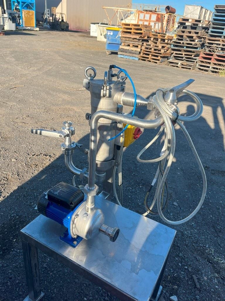 Stainless steel 316L basket filter fitted with a pump and mounted to a stainless steel table.