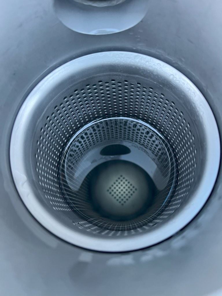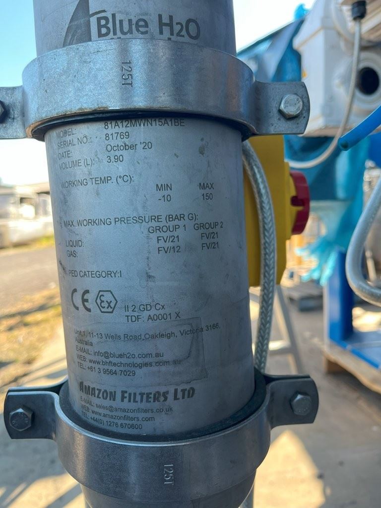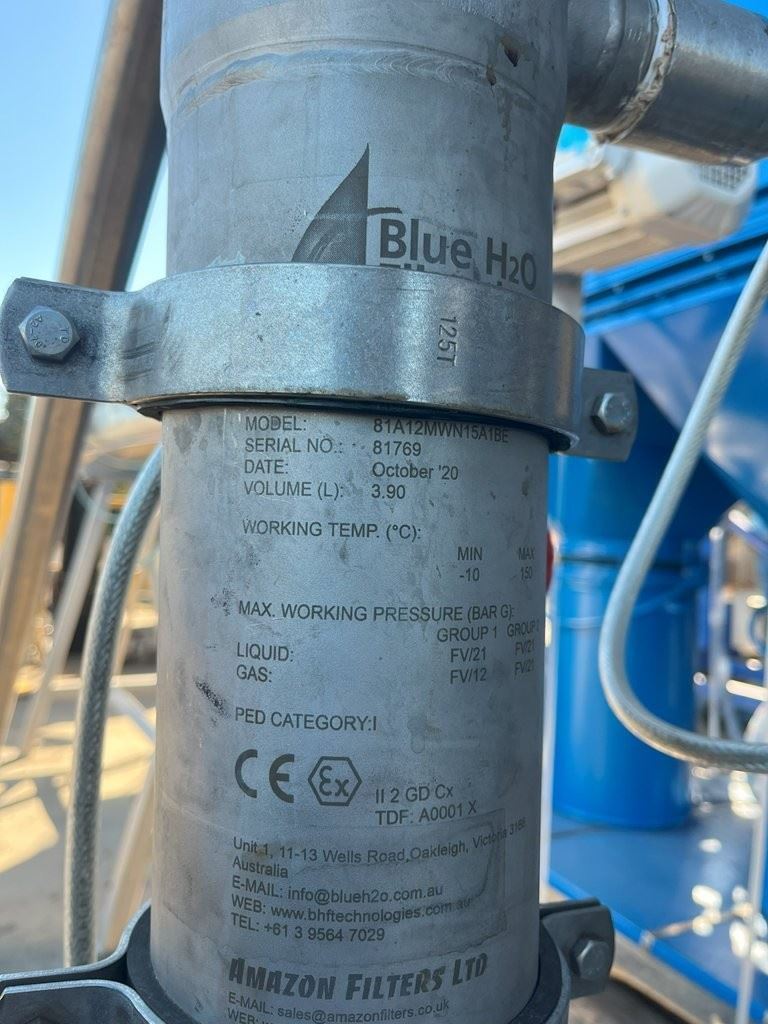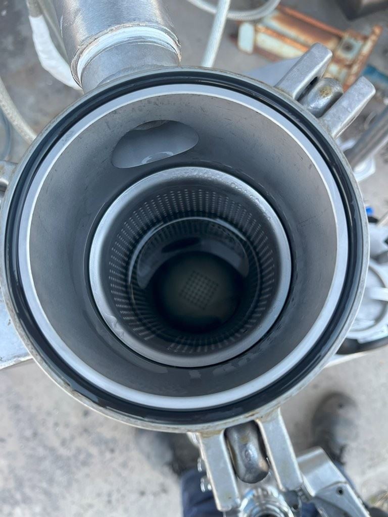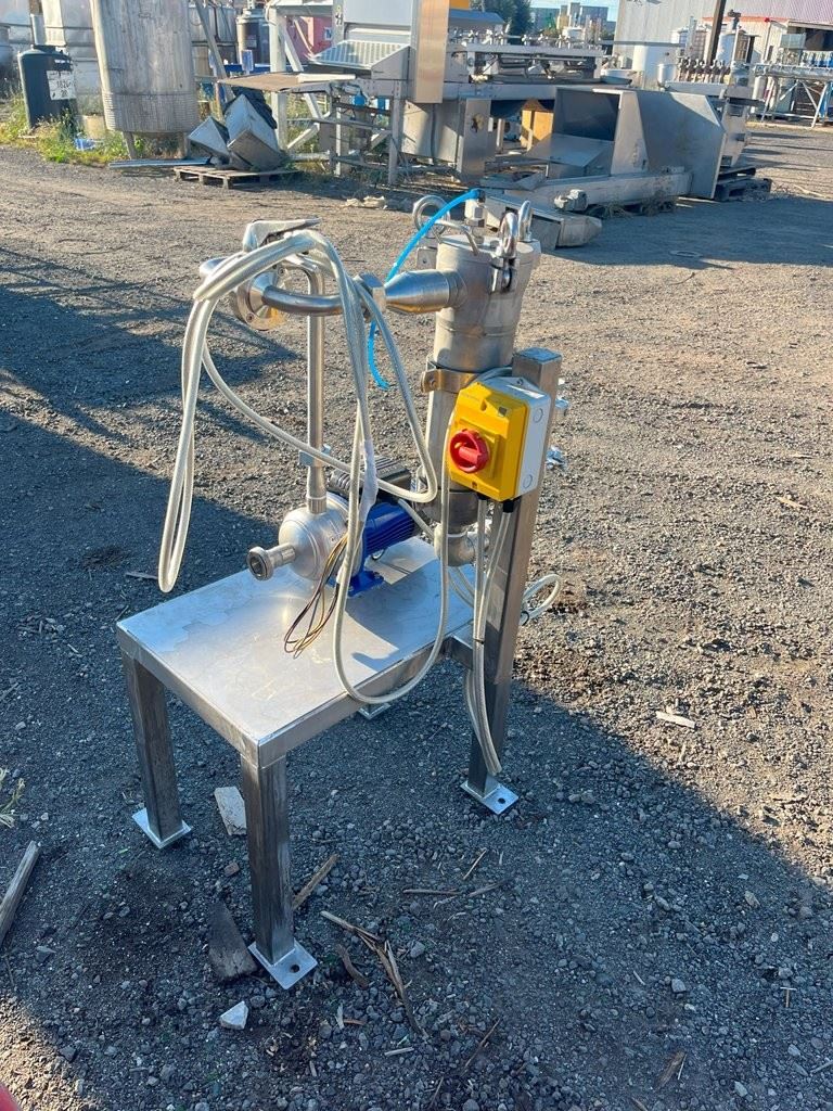 Stainless steel 316L basket filter fitted with a pump and mounted to a stainless steel table.