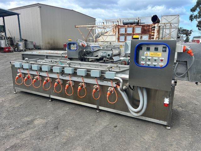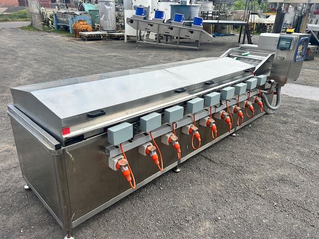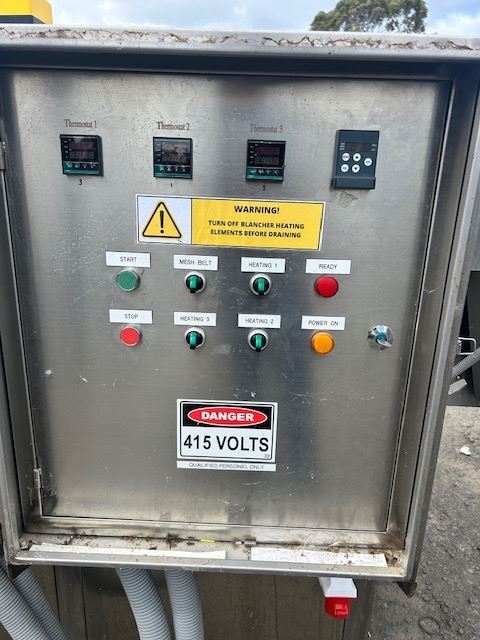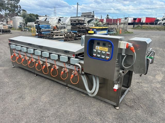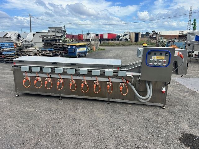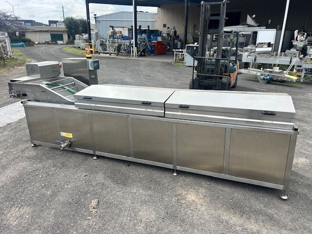 The unit features a water bath with heating elements capable of reaching temperatures up to 95°C. Currently fitted with one conveyor, it also includes an additional conveyor that can be installed to keep products fully submerged as they move through the bath.