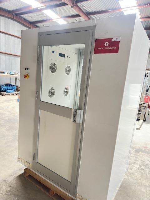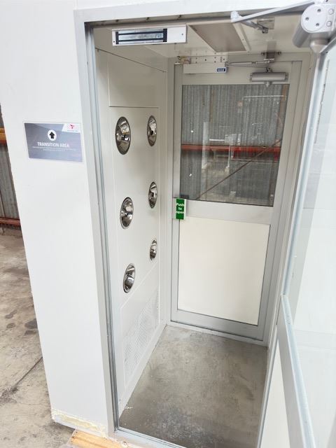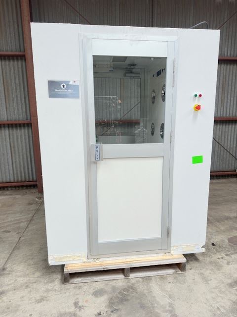 Personnel and materials entering or exiting the controlled environment are – scrubbed – with H14-filtered air by high-velocity air jets running at 18-30 m/s (3543-5906 fpm). Contaminated air is then drawn through the base within the unit, filtered and recirculated.