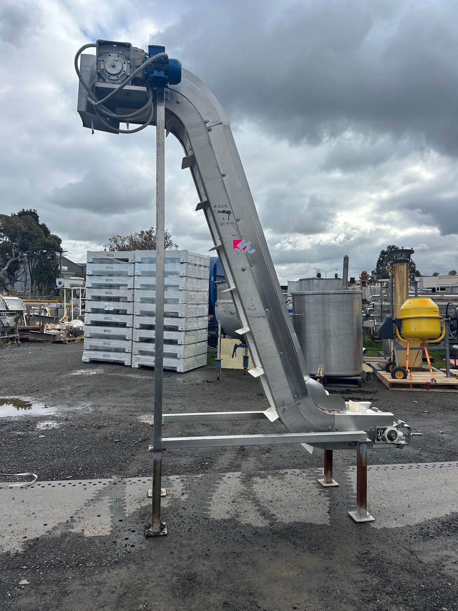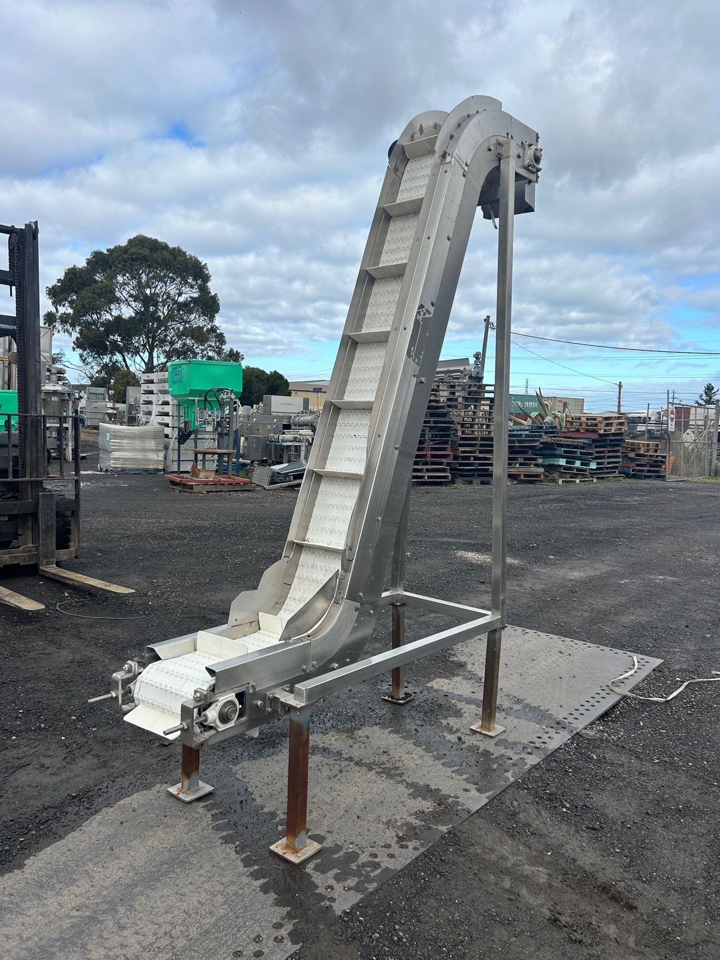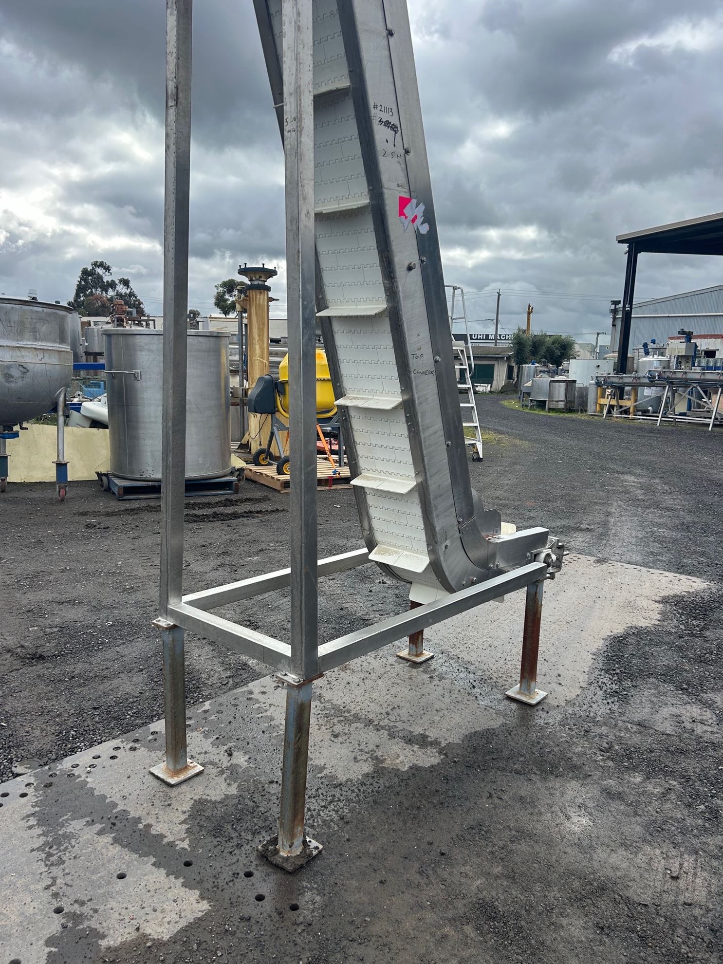 250mm wide plastic cleated belt, 300mm between cleats, 80mm high cleats.