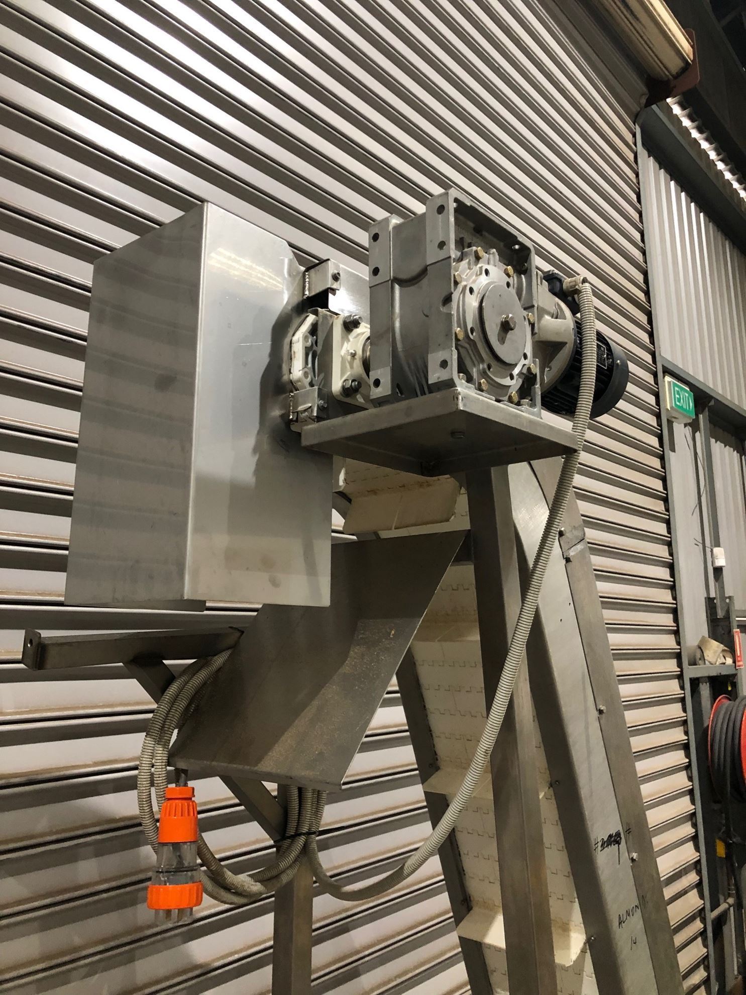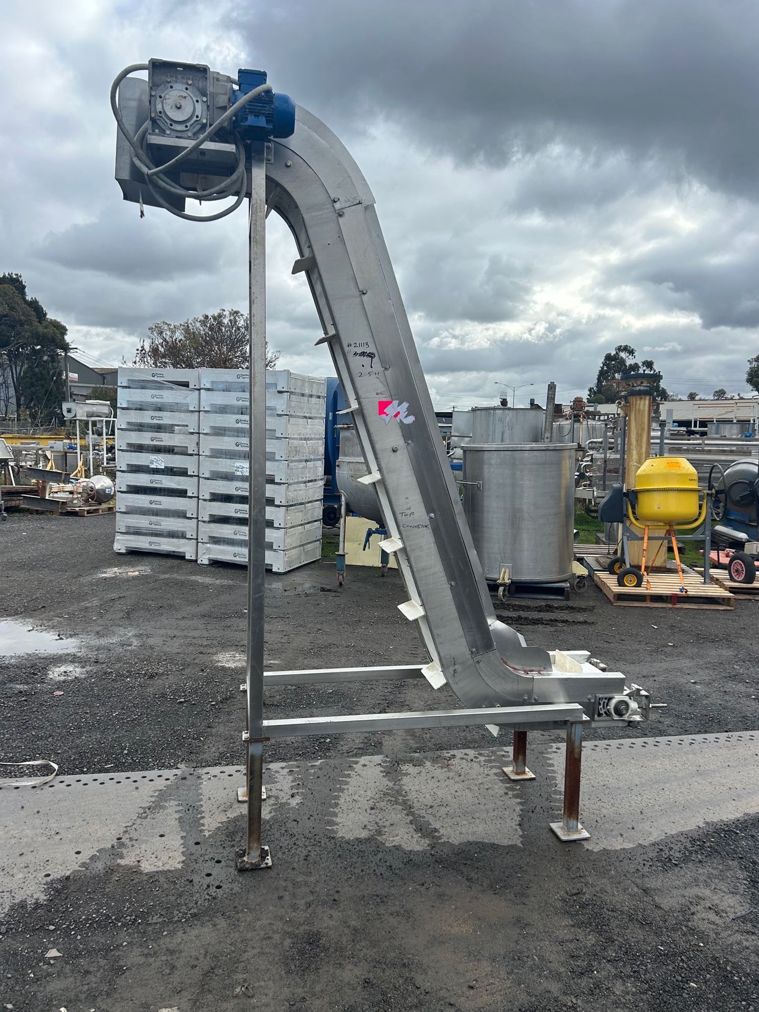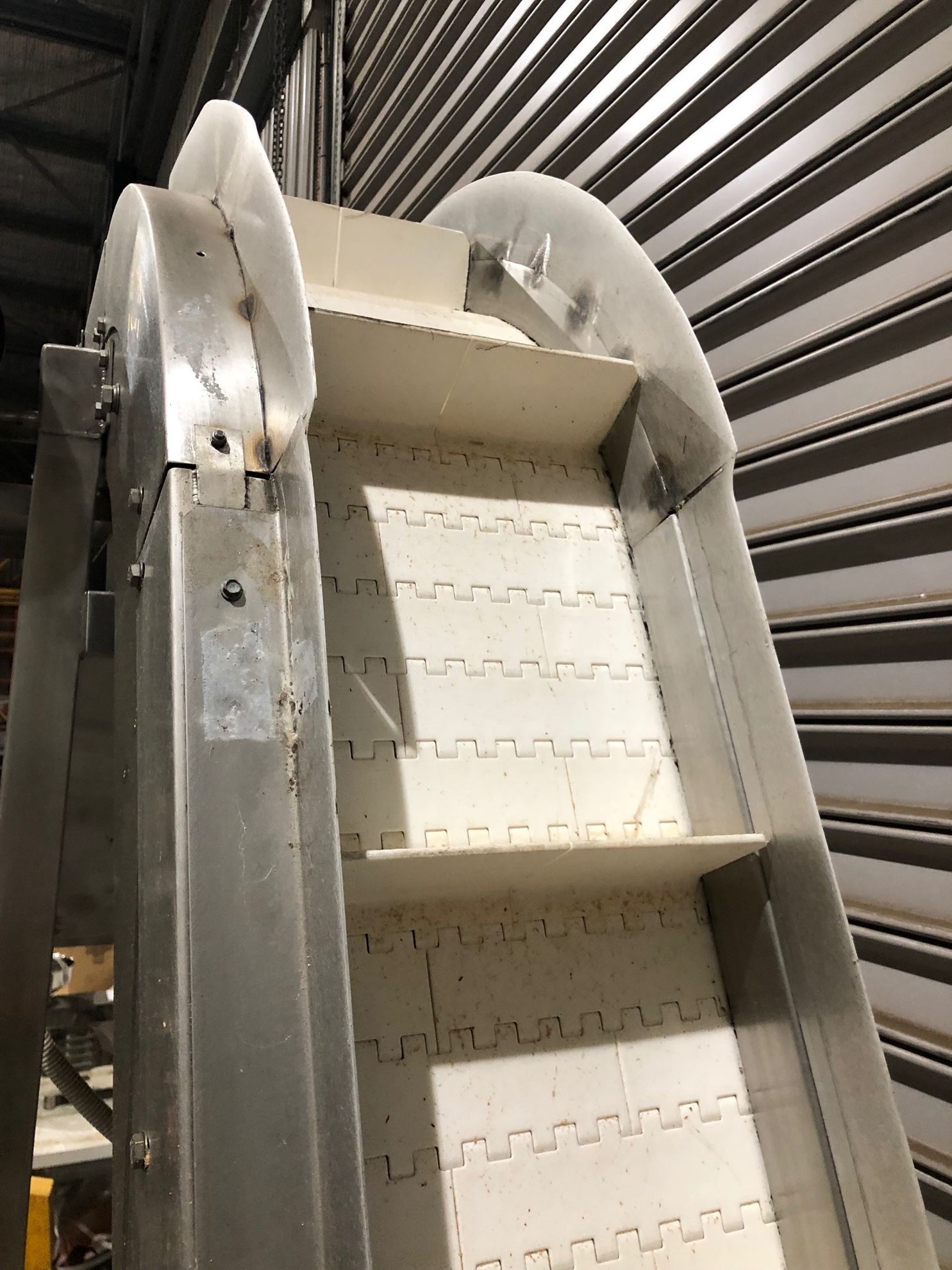 250mm wide plastic cleated belt, 300mm between cleats, 80mm high cleats.