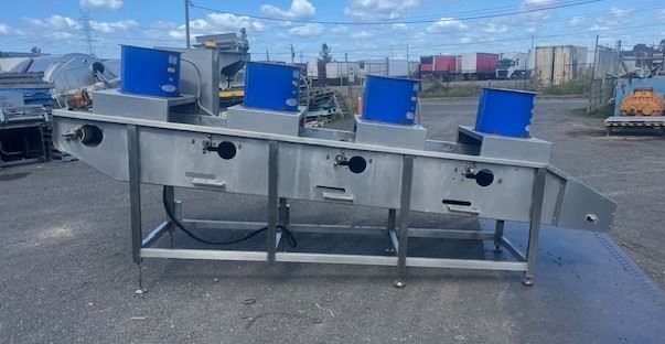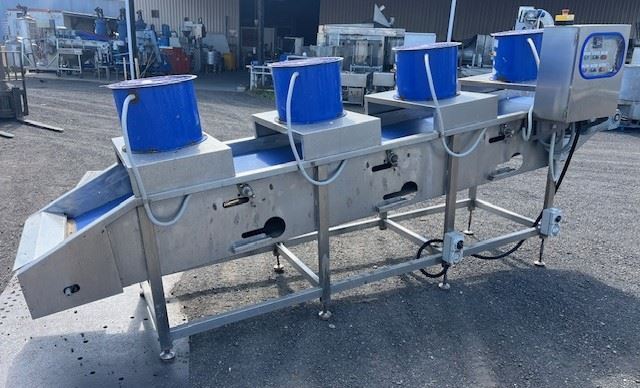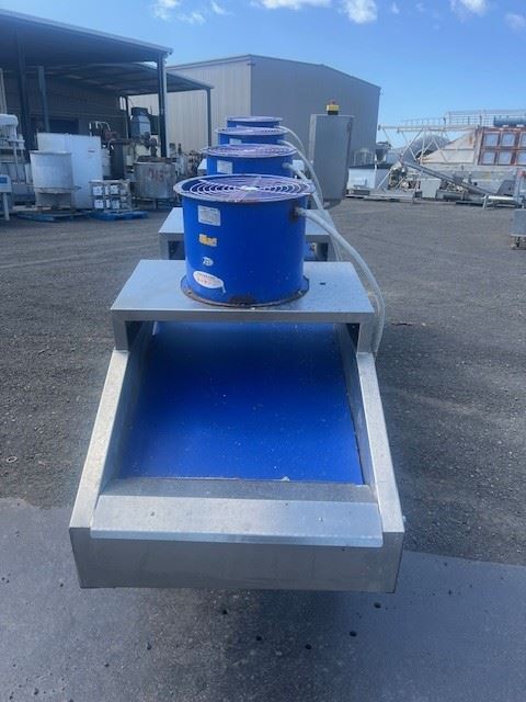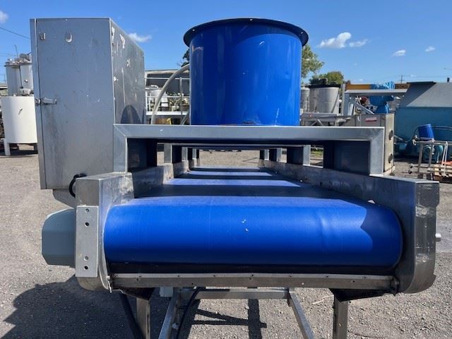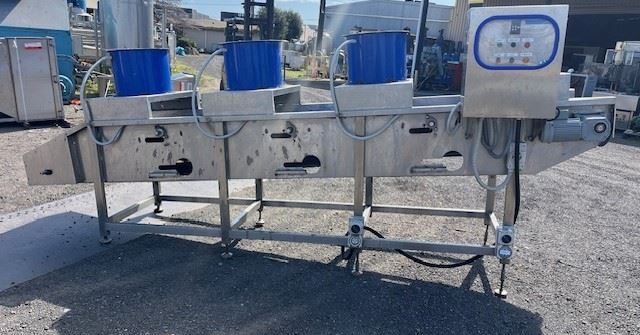 Incline flat belt conveyor. Stainless steel design with food grade belt.Complete with 4 x air fans mounted above the conveyor.750mm wide x 3 m long .75kw 28 rpm VSD control Adjustable feet.Currently set up as an incline conveyor.