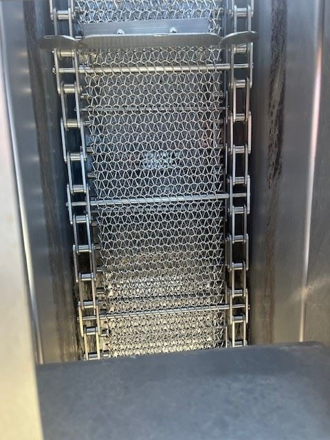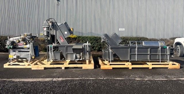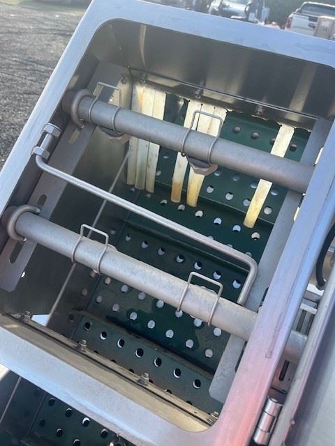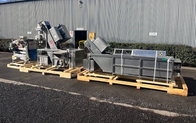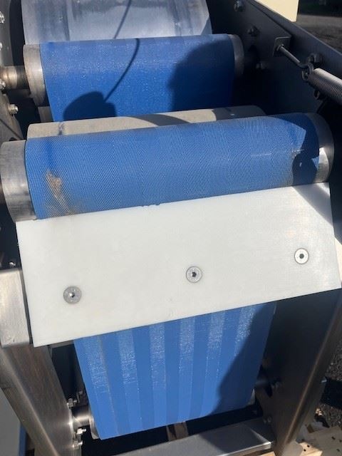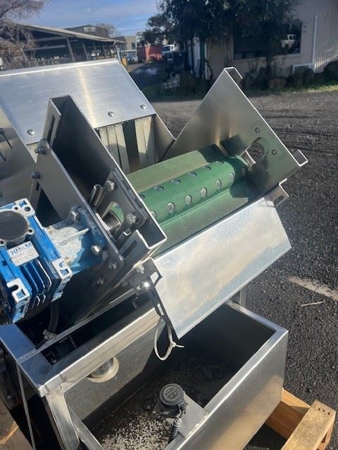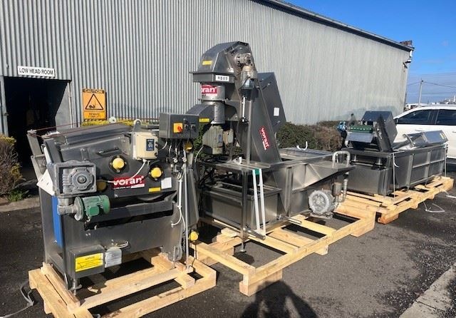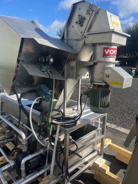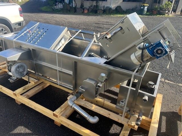 o Produce is loaded into a water-filled wash trough where powerful blowers push it towards the incline conveyor. The cleated belt lifts the cleaned produce into the next stage.