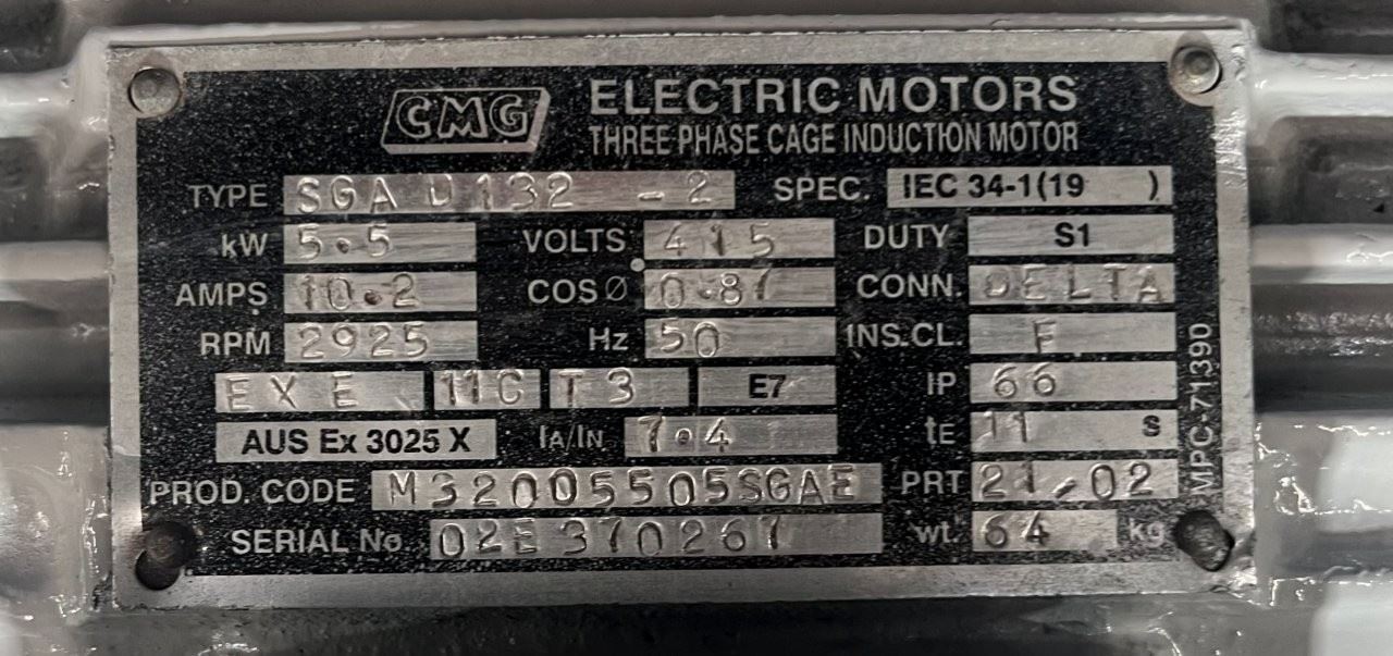 Ex. rated motor: 3 Phase 5.5kW, 415V, 10.2A, 2925 RPM.