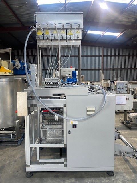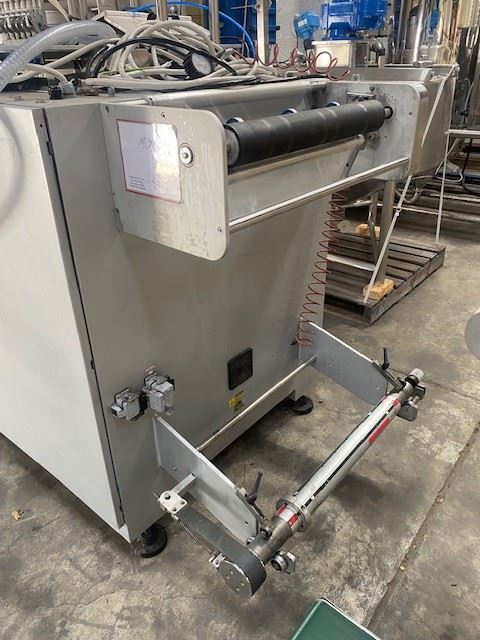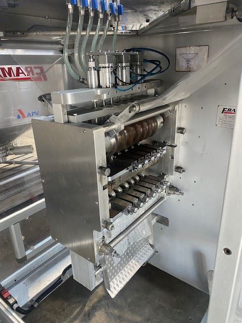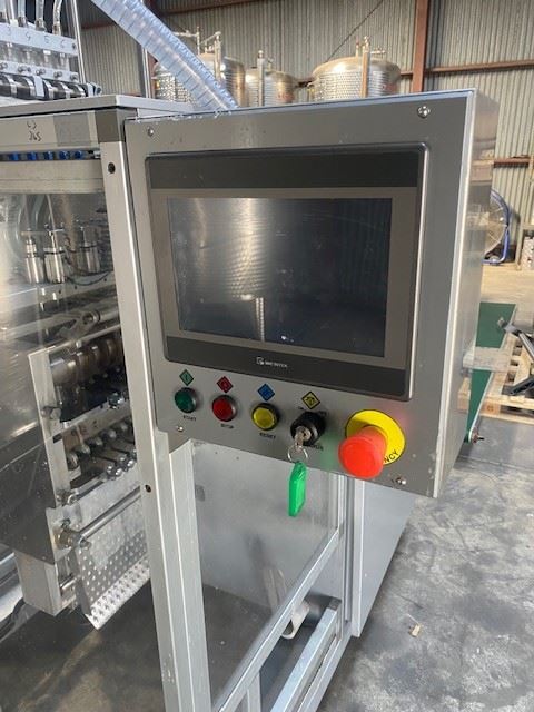 The machine is a continouos cycle packaging machine which by a heat sealing wrap roll forms a bag, fills it with a set product dose and seals the bag the bags are then discharged via the conveyor.