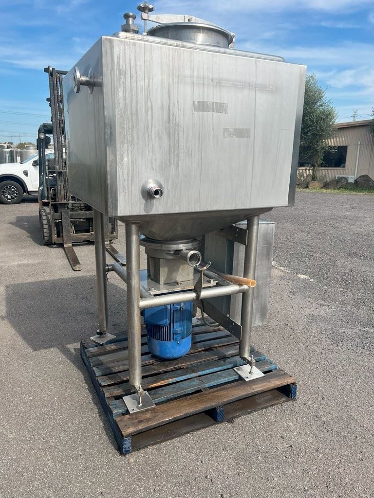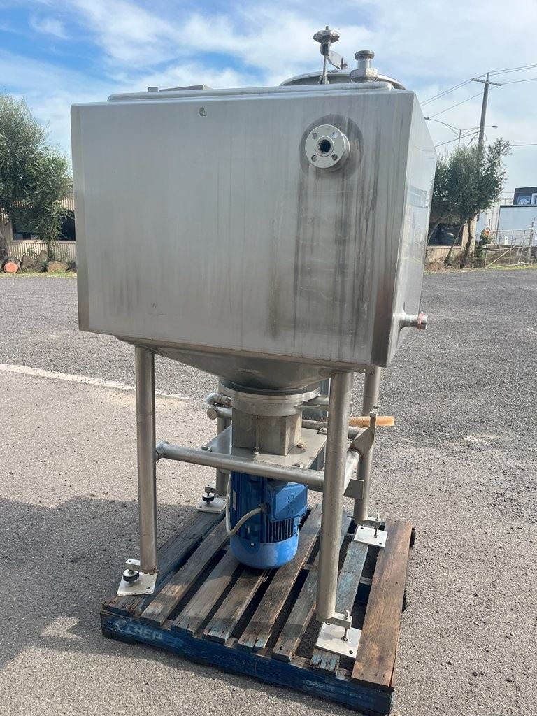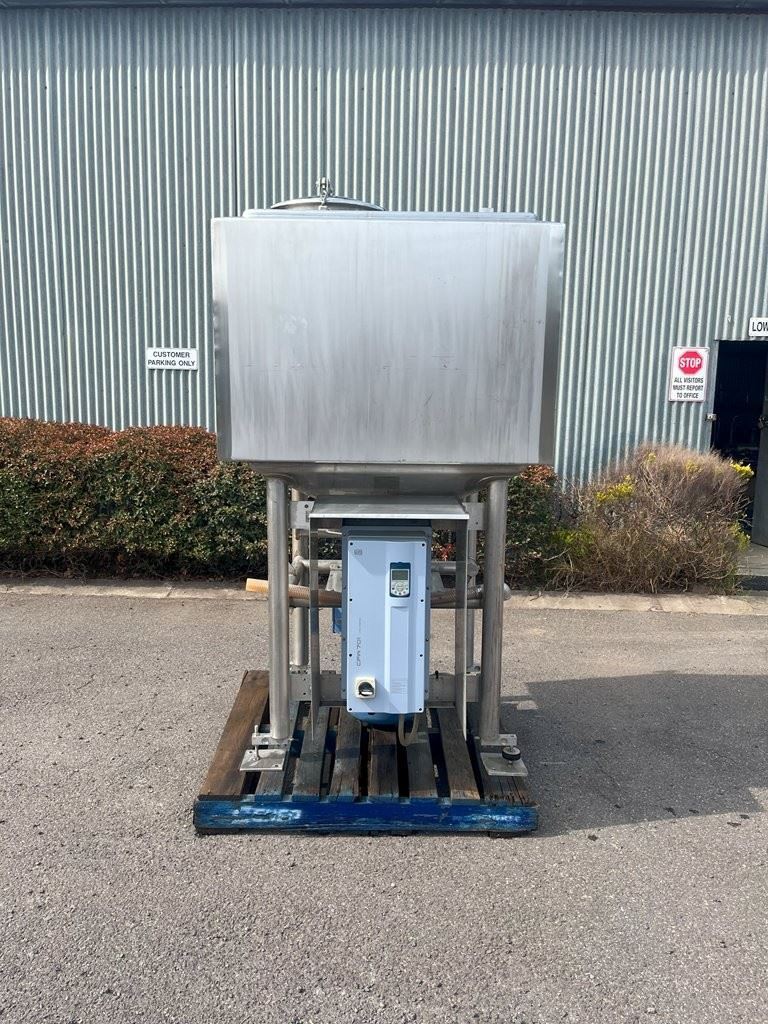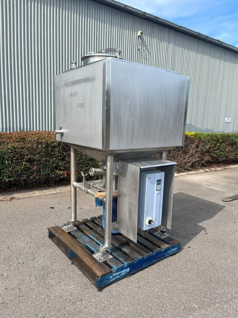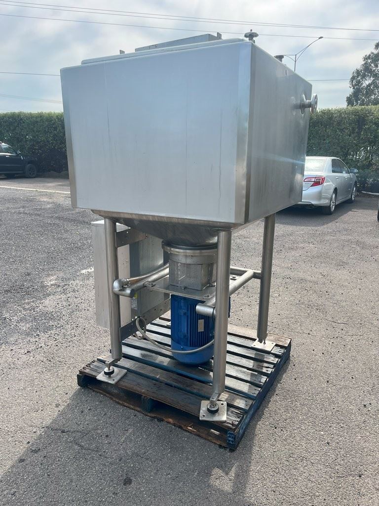This unit is a square shaped tank with a bottom mounted high speed mixing impeller. The impeller generates an axial flow, which is re-circulated in the tank via the surrounding mixer chamber. The square shaped tank ensures that there will be no forced rotation of liquids in the tank (forced vortex). On the contrary a free vortex will be created which sucks the liquid down towards the mixing impeller (like in a bath tub outlet, a plug-hole).