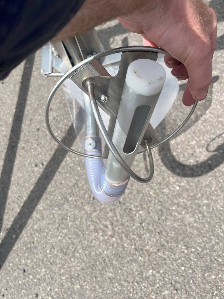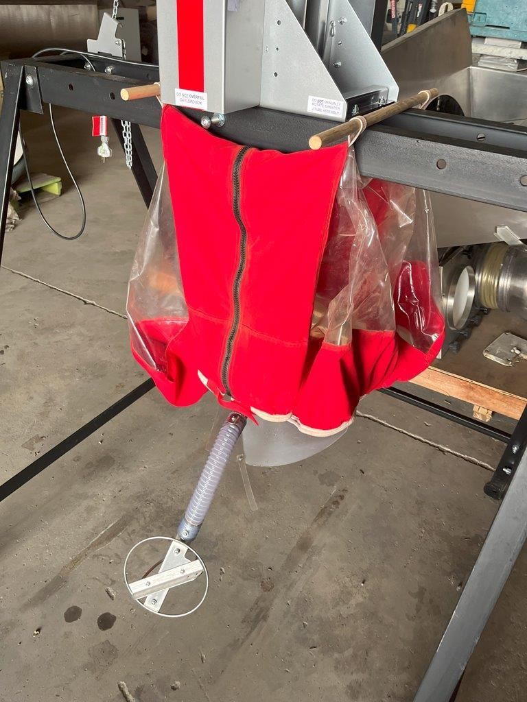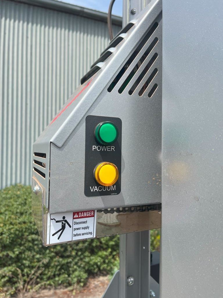 The Sweeper assembly is lowered onto the top of the pile of material in a new gaylord or octobin. When the vacuum of the conveying system starts, it enables a vacuum switch on the Sweeper to begin to rotate on top of the material pile.