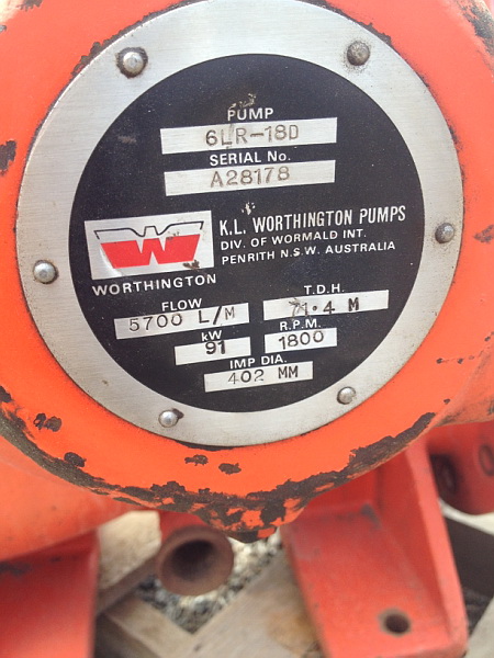 Worthington. Model 6 LR-180. 150mm Outlet x 250mm Inlet. Flow 5700L/Min. (342m3/hr) Max Head 71.4m KW 90. RPM 1800. Imp Diam 402mm.