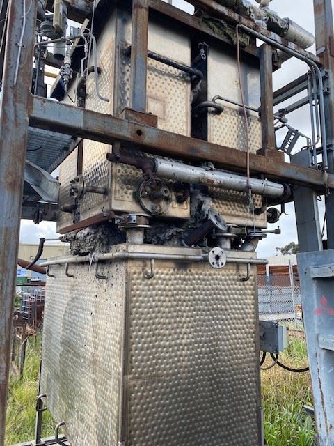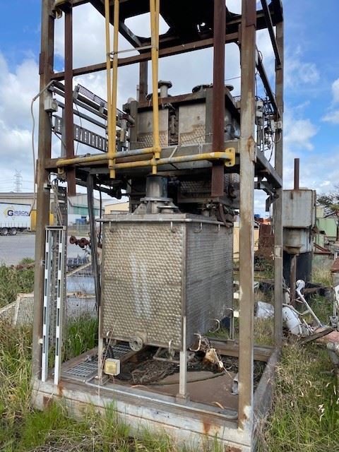 Process Tower, consists of 4 x 400L SS dimple jacketed tanks, 1 x 2000L SS dimple jacketed tank, 1 x 2inch hot product BLAKERS pump, all set up on a stand.