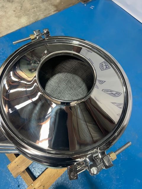 400mm dia with 2 decks (3 outlets), currently fitted with 1mm and 0.5mm St/Steel mesh.